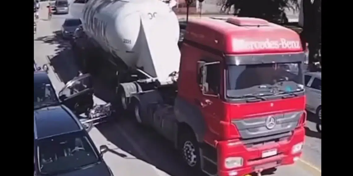 Imagens impressionantes: Motoqueiro é atropelado por carreta e sai ileso; VEJA VÍDEO