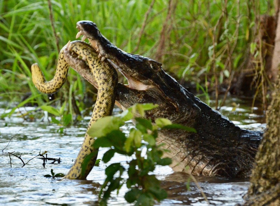 VÍDEO: jacaré e sucuri travam briga em rio do Pantanal de MT