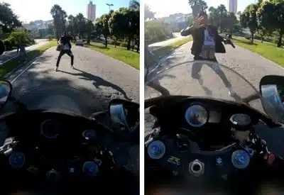 IMAGENS FORTES: motociclista impede assalto e atropela suspeito em SP; VEJA VÍDEO