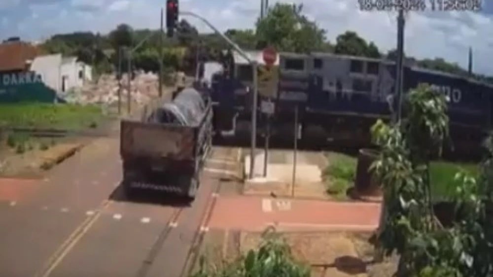 VÍDEO: carreta avança sinal e é atingida em cheio por trem; imagens impressionam