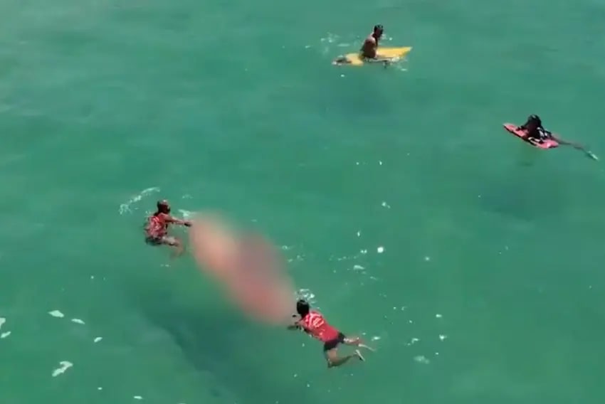 Um vídeo mostra três socorristas colocando o corpo em uma prancha e depois o carregando até a areia