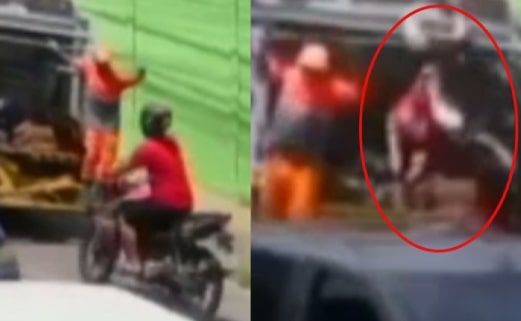 A colisão foi tão forte que o motociclista foi jogado para dentro do coletor de lixo do caminhão
